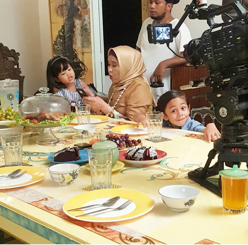 “Hadiff belum boleh membaca lagi.Jadi sebelum masuk ke set saya kena cerita dulu macam mana keseluruhan jalan cerita sebenar. Dan untuk scene yang Hadif lakonkan saya kena cerita situasi dan beritahu Hadif apa dialog dan macam mana perlu deliver watak itu.Memang kena hafalah dialog tu,”jelas puan Wan Musfirah Aimi.