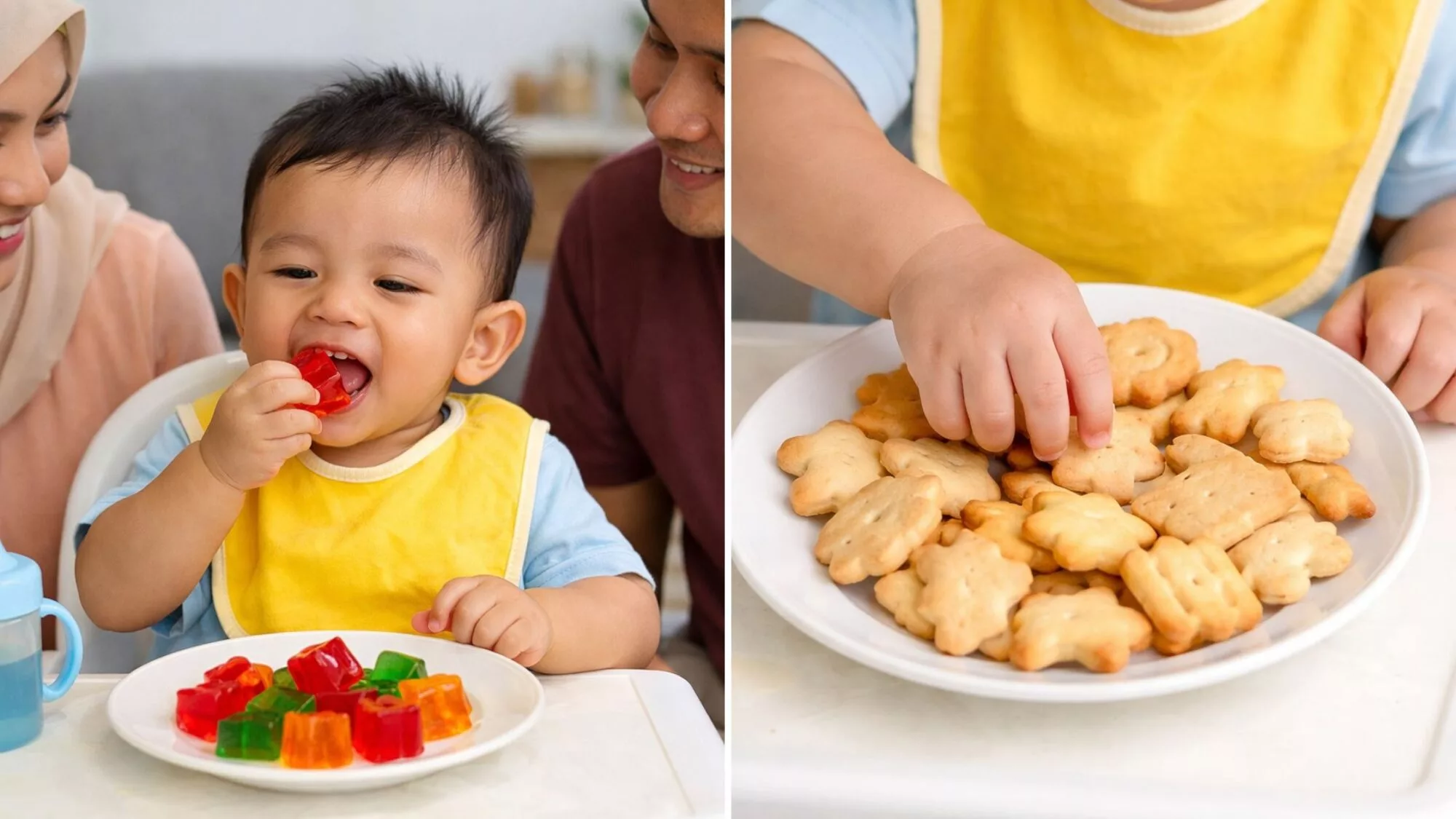 Bila anak sudah pandai makan kita kadangkala tak perasan tersuap dia biskut yang bukan khusus untuk bayi. Jangan pandang remeh kerana kebanyakan biskut yang dijual di pasaran mengandungi terlalu banyak gula dan garam yang masih belum sesuai diambil oleh bayi.