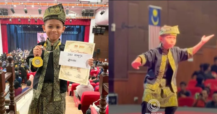Lengkap dengan busana silat serba hitam bercorak keemasan serta tanjak di kepala, penampilannya menyerlahkan aura seorang pendekar kecil yang memikat perhatian penonton.