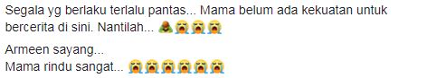 Kehilangan yang dihadapi ibu ini tidak dapat penulis selami, tentunya tidak mudah melihat si kecil sudah tiada lagi. Puan Wan Nur Azalina jelas rindukan anak syurganya Armeen Shaquille yang mengalami Spastic Quadriplegic With Severe Dystonic Cerebral Palsy.