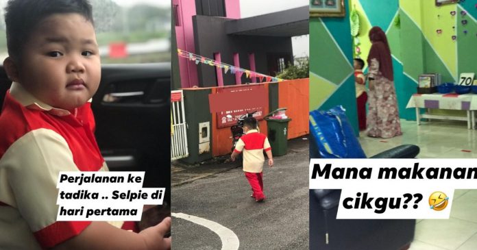 Gelagat anak lelakinya yang pertama kali ke tadika bukanlah menangis tetapi hanya menggunakan umpan makanan baru bersemangat untuk masuk tadika.