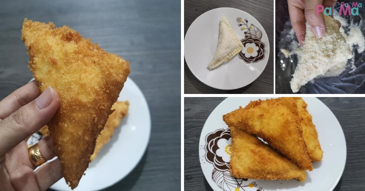 4. Selepas tu boleh buat bentuk segitiga. Tutupkan rapat supaya inti tak keluar nanti.