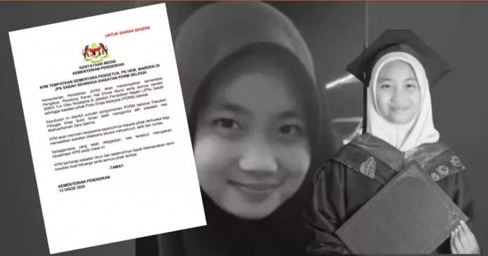 Bagi yang sentiasa mengikuti perkembangan siasatan kes Allahyarham adik Zara Qairina Mahathir, terkini Kementerian Pendidikan (KPM) akan menempatkan sementara Pengetua, Penolong Kanan Hal Ehwal Murid (HEM) serta semua warden Sekolah Menengah Kebangsaan Agama (SMKA) Tun Datu Mustapha di Jabatan Pendidikan Negeri (JPN) Sabah sehingga siasatan Polis Diraja Malaysia (PDRM) selesai.